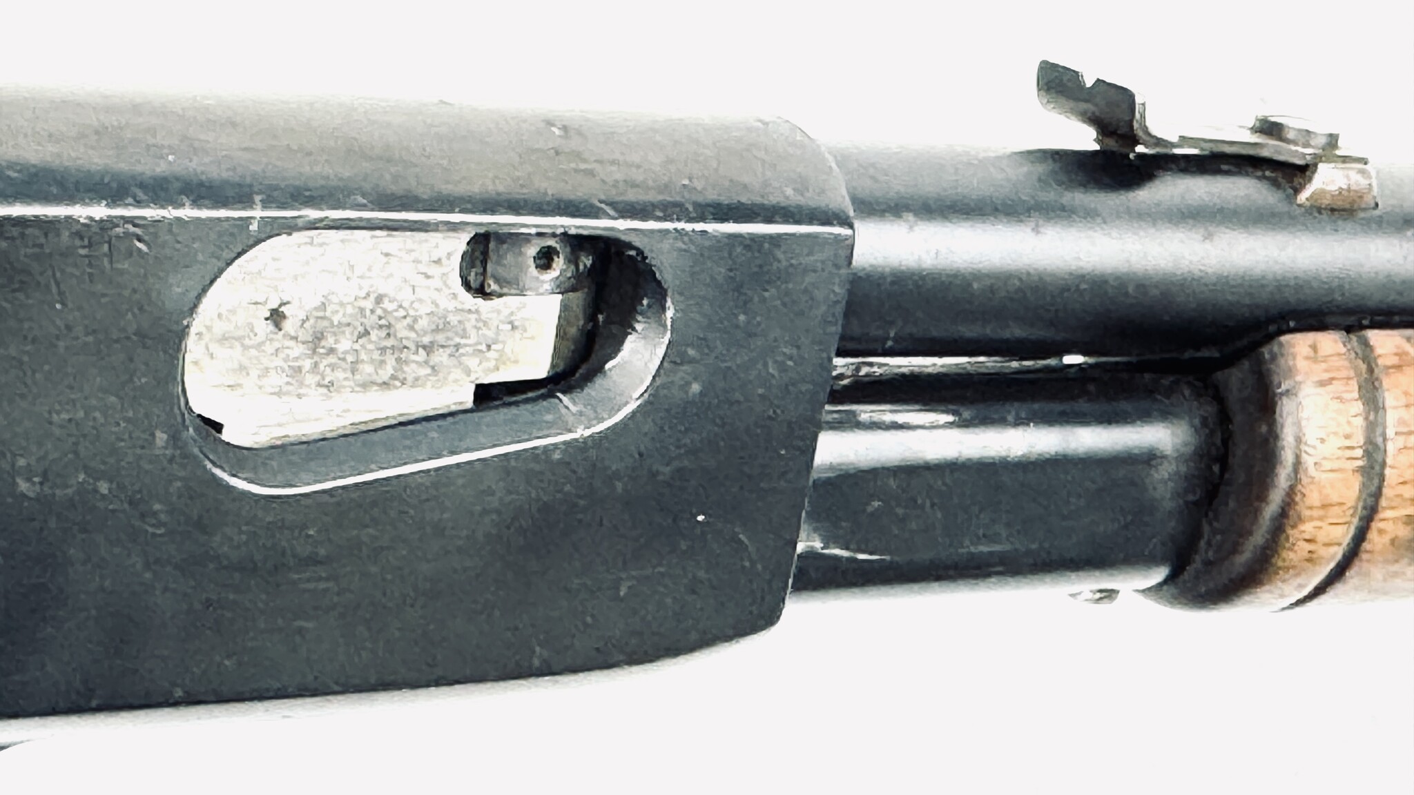 The Model 12's magazine was loaded by depressing a catch on the knurled end cap, which allowed the inner tube that contained a spring-loaded follower to be withdrawn forward and exposed an opening just in front of the forearm into which individual cartridges were inserted base-first. The inner tube was then pushed back and locked in place, exerting spring pressure on the foremost cartridge in the magazine for feeding into the receiver.