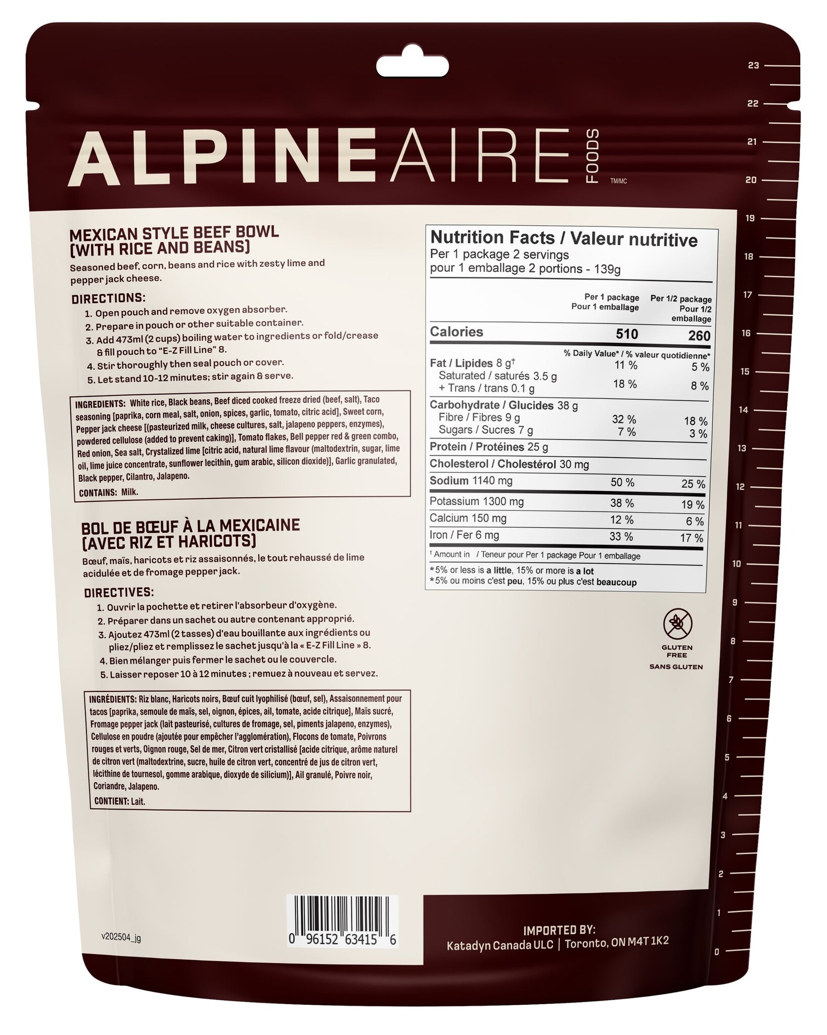 Ingredients: Instant White Rice, Black Beans, Beef Diced Cooked Freeze Dried (Beef, Salt), Taco Seasoning [Paprika, Corn Meal, Salt, Onion, Spices, Garlic, Tomato, Citric Acid] Sweet Corn, Pepper Jack Cheese (Pasteurized Milk, Cheese Cultures, Salt, Jalapeno Peppers, enzymes), Powdered Cellulose (added to prevent caking)], Tomato Flakes, Bell Pepper Red Green Combo, Red Onion, Sea Salt, Crystalized Lime [Citric Acid, Natural Lime Flavor (maltodextrin, sugar, lime oil, lime juice concentrate, sunflower lecithin, gum arabic, silicon dioxide)] Garlic Granulated, Black Pepper, Cilantro, Jalapeno.