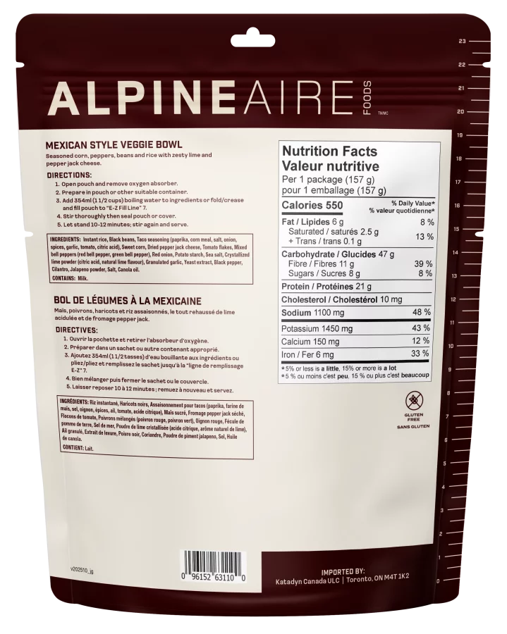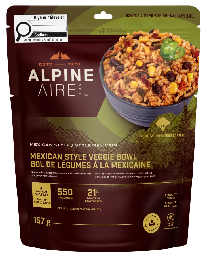 AlpineAire Foods Mexican Style Veggie Bowls offers hikers a tasty treat at the end of the day, with corn, peppers, rice, zesty lime and pepper jack cheese.