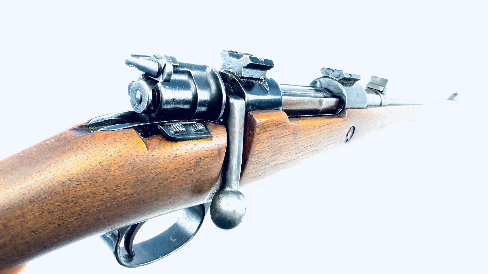 The Mauser M 98 bolt mechanism can be easily removed from the receiver simply by pulling out the bolt stop, located at the left wall of the receiver, and then by rotating and pulling the bolt out.