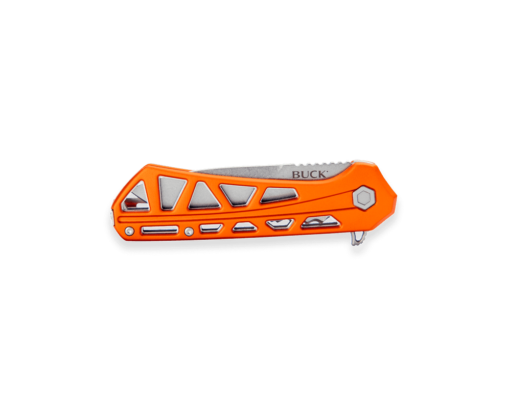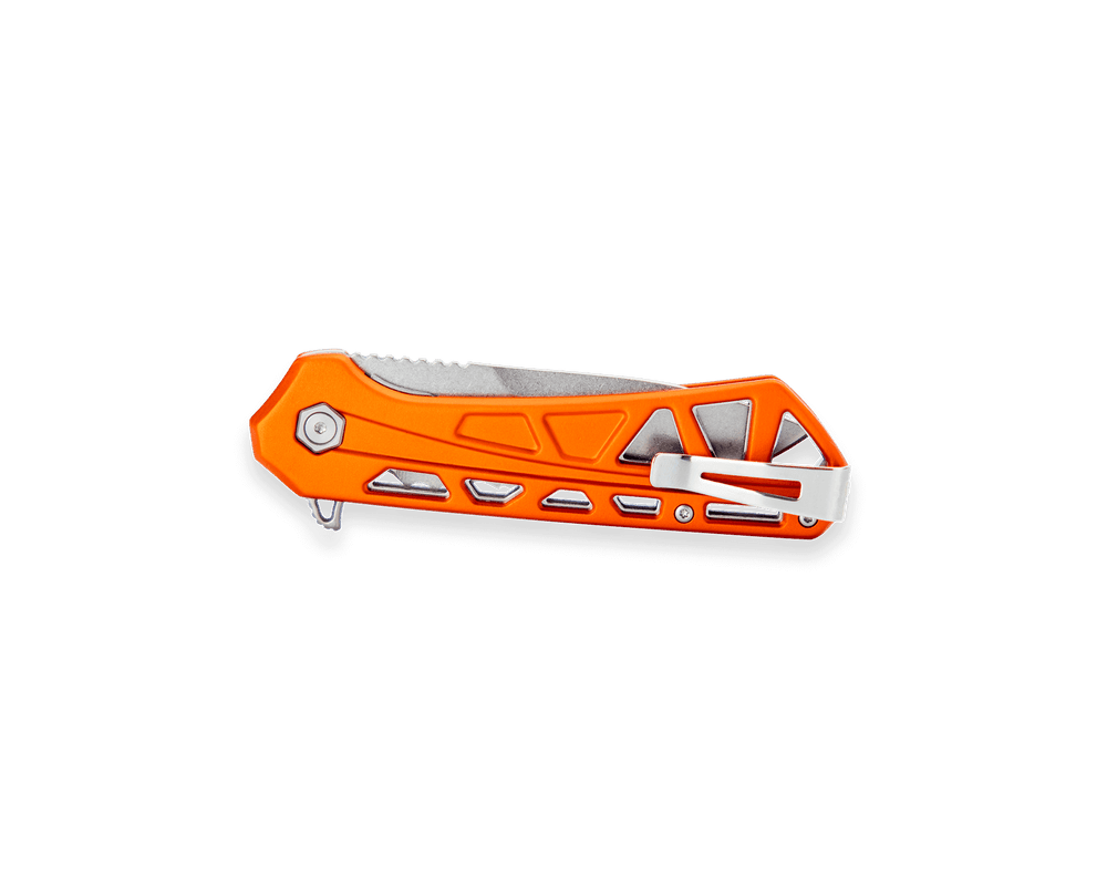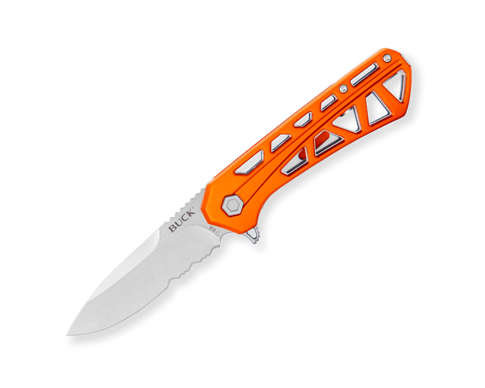 The 812 Trace is an everyday carry pocket knife designed for the outdoors enthusiast. The skeletal design and anodized aluminum handles make this knife sturdy and lightweight.The partially-serrated drop point blade adds versatility to its function. Featuring a liner lock, an ergonomic handle shape, and jimping on top of the blade to improve grip, this ball bearing flipper has a smooth action and tuned detent. Pocket clip is removable and reversible for an ambidextrous carry.