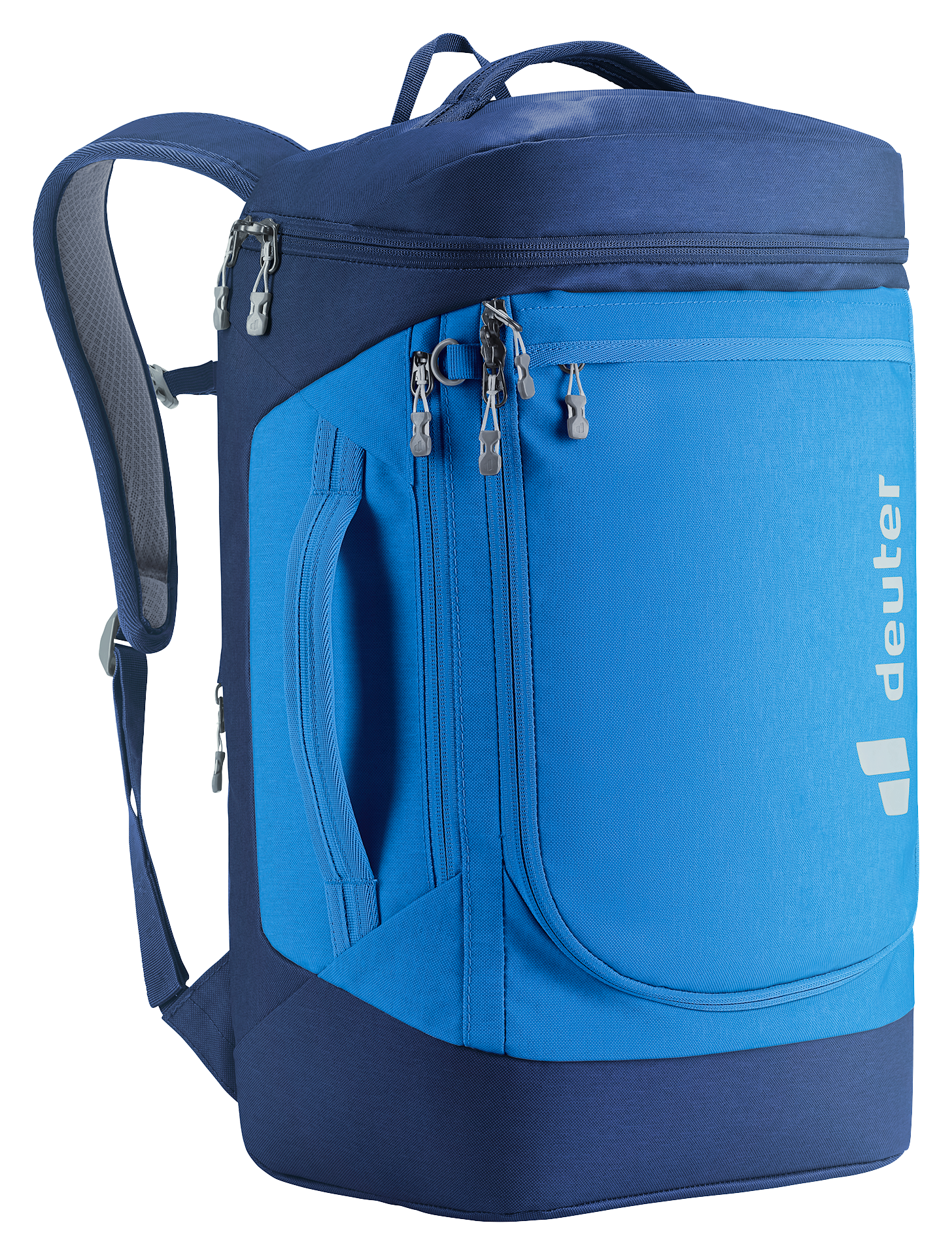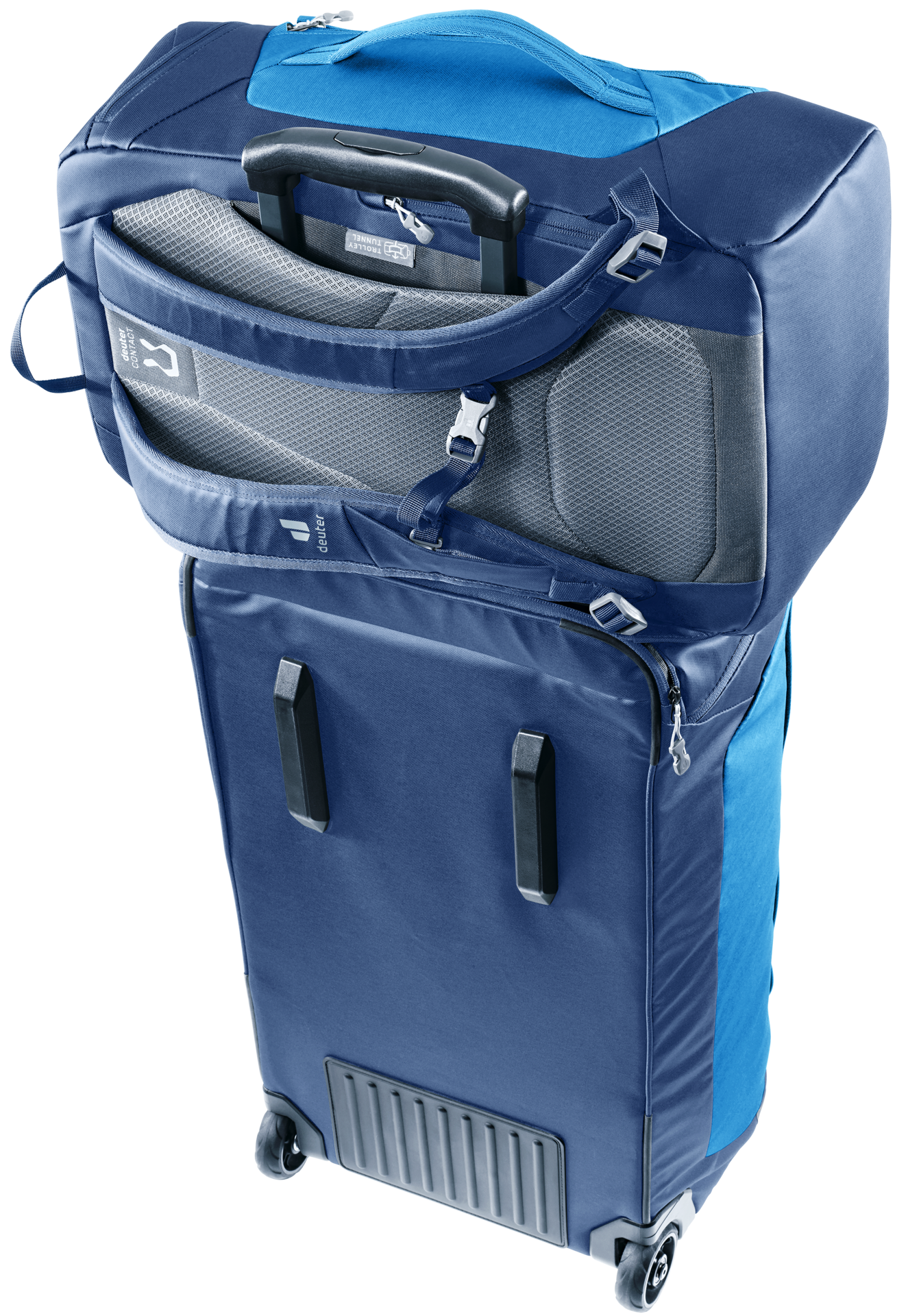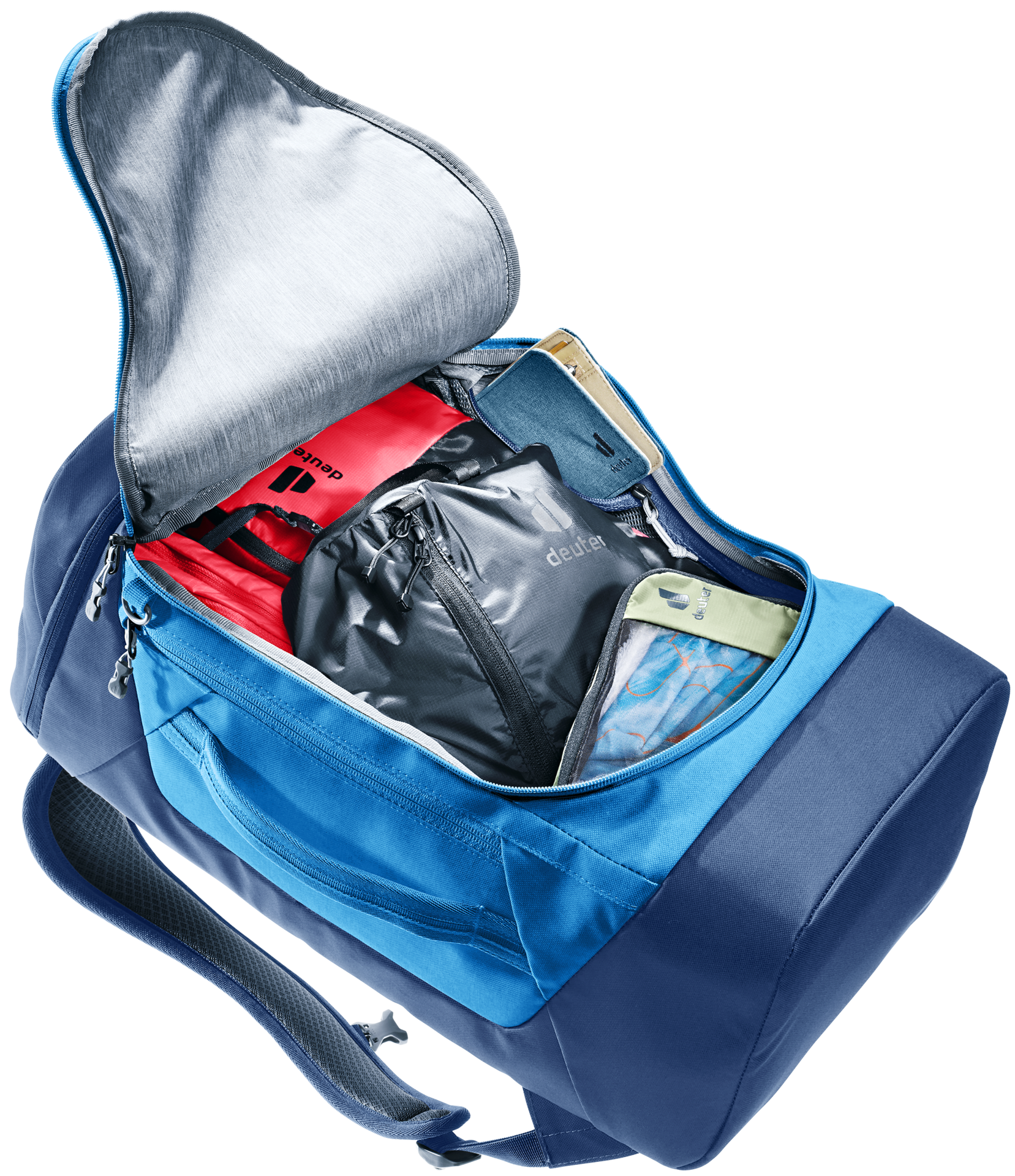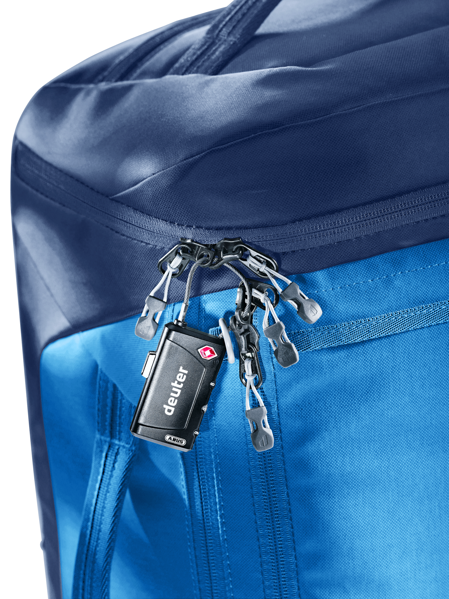 The Duffel Pro Pack features the deuter Contact back system with padded shoulder straps and grab handles. It has a pass-through sleeve at the back for securing to the pull-out handle of a wheeled suitcase or bag. Various pockets, compartments and a removable organizer unit keep contents well organized and offer enough space for minimalist one-bagging packers. A single padlock anchor point locks all zippers. Made from tough, durable materials, and with a stable base, plus carry-on dimensions, it’s perfect for travel by bus, train or plane.