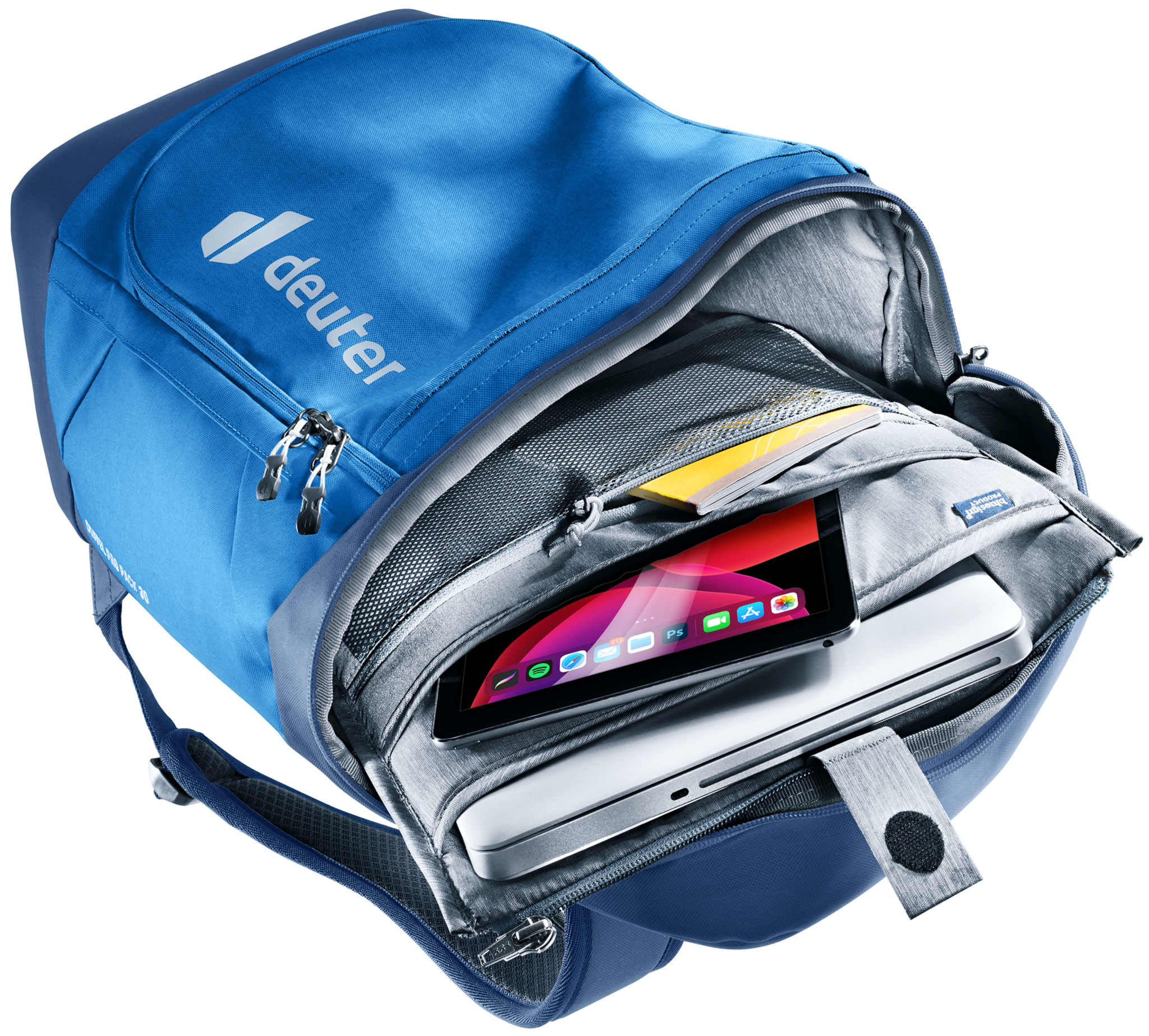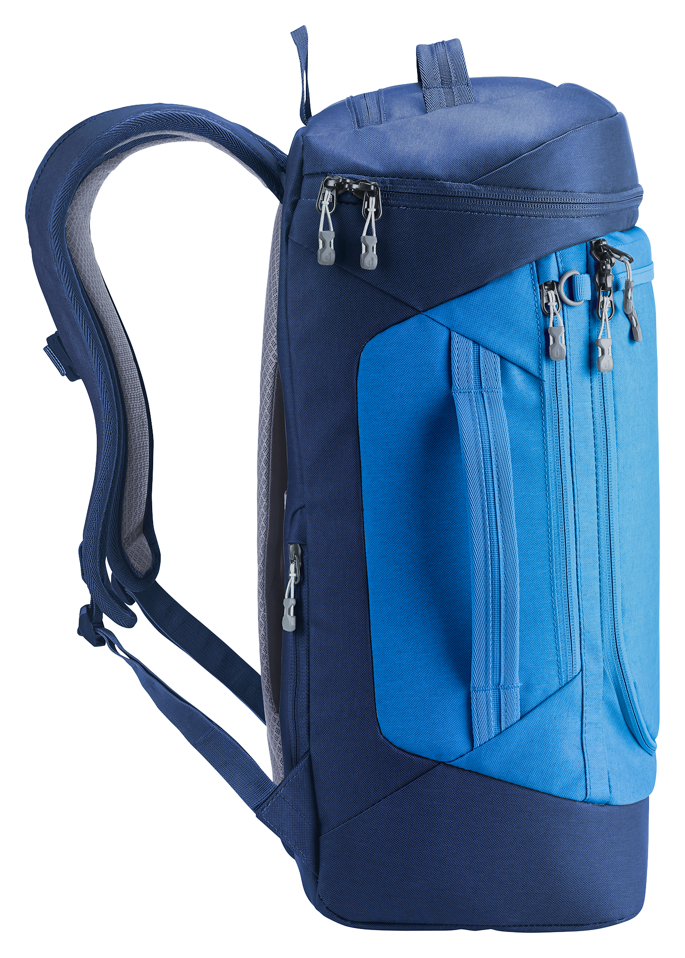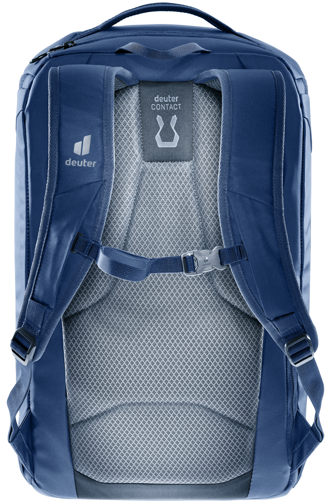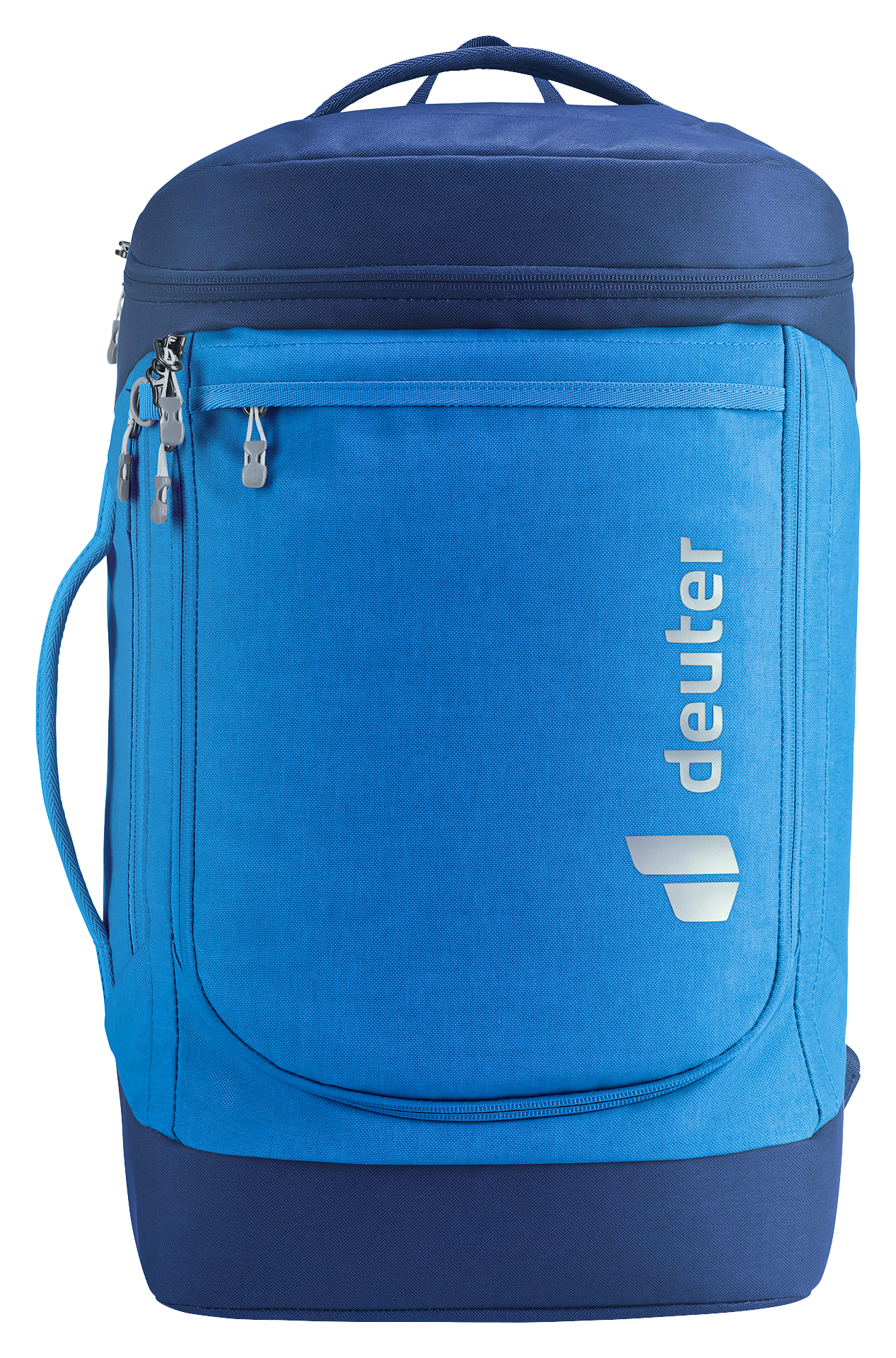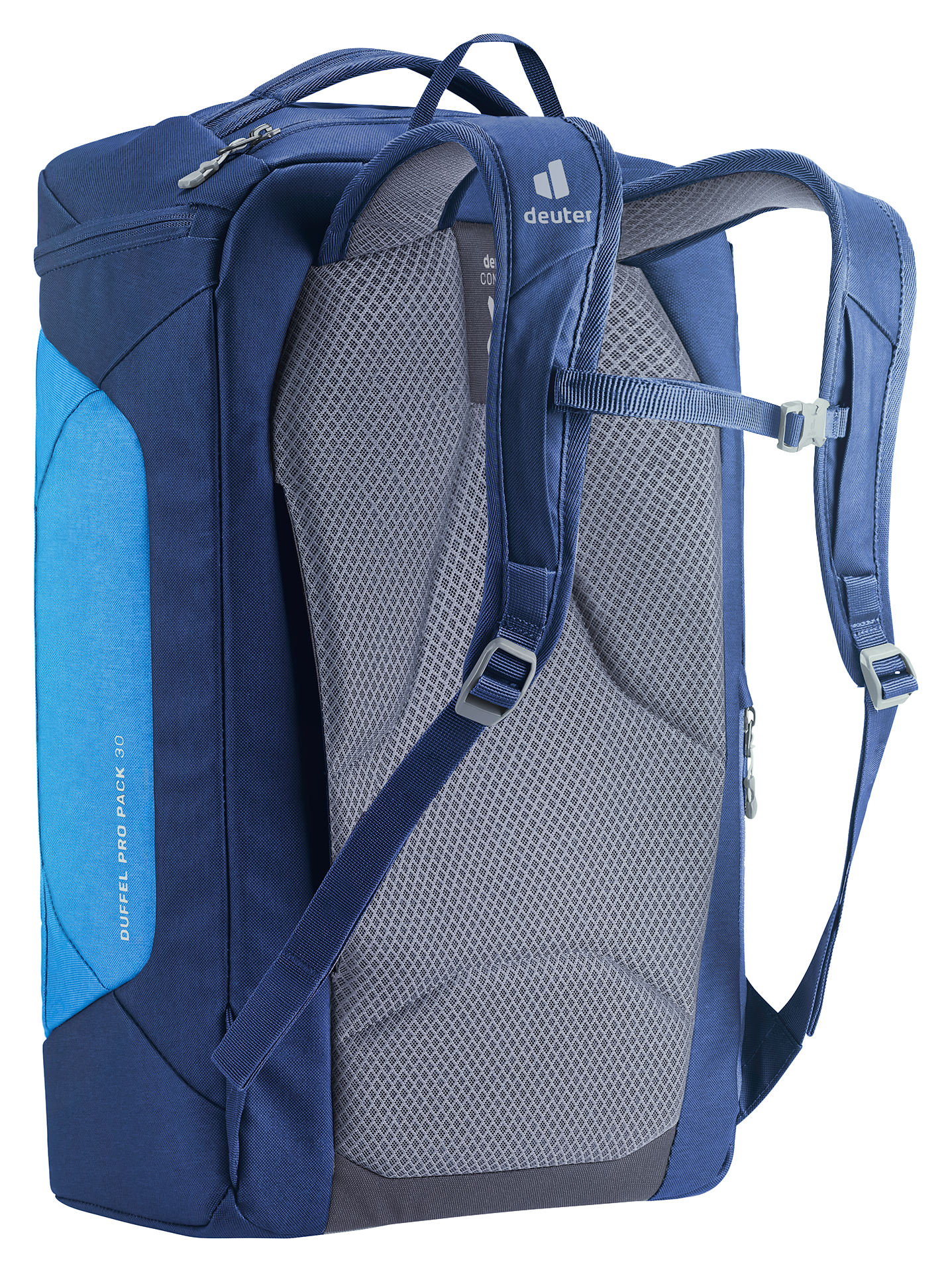 The Duffel Pro Pack features the deuter Contact back system with padded shoulder straps and grab handles. It has a pass-through sleeve at the back for securing to the pull-out handle of a wheeled suitcase or bag. Various pockets, compartments and a removable organizer unit keep contents well organized and offer enough space for minimalist one-bagging packers. A single padlock anchor point locks all zippers. Made from tough, durable materials, and with a stable base, plus carry-on dimensions, it’s perfect for travel by bus, train or plane.