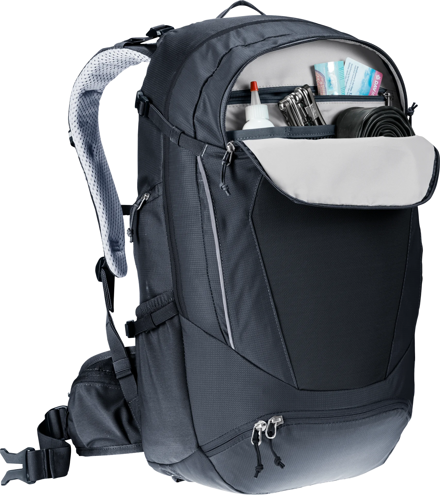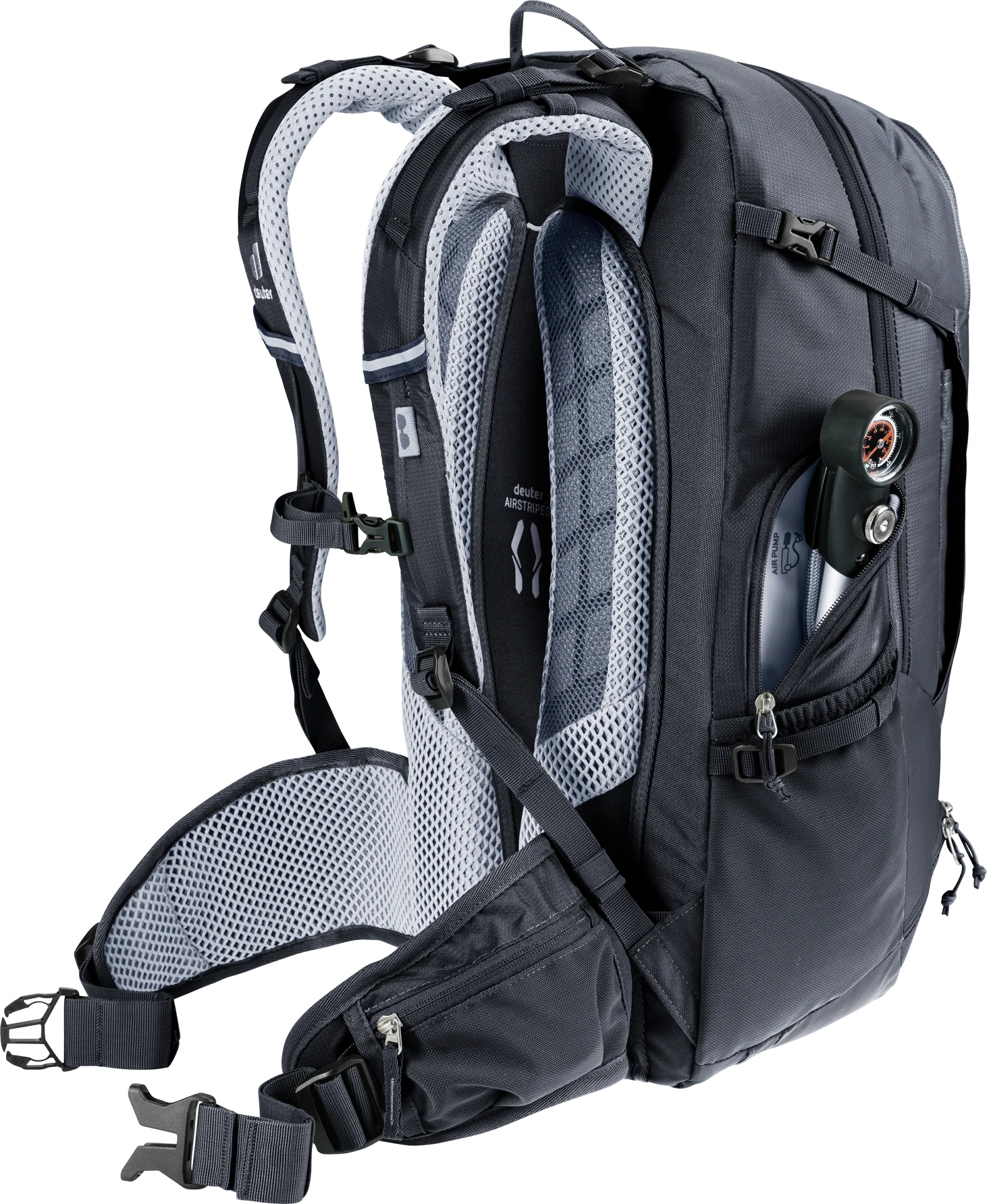 The clever layout, with tool and pump compartments, for instance, plus a handy front stash pocket which can also accommodate a helmet, plus a subdivided main compartment give this pack easy handling and clever organization. The deuter Airstripes back system allows air to flow across the back for good ventilation while creating a snug, solid fit for tackling challenging trail sections without load wobble.