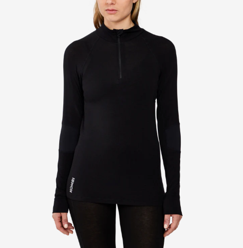 This new lightweight KOMBI women's base layer zip top delivers comfort and warmth. Made of ultra-soft Tencel and MerinoMIX ACTIVE ethically sourced Merino wool, our women’s base layer provides silky-soft comfort for when you’re truly active. Perfect for a multitude of winter sports, this Merino wool base layer also features ventilation zones under the arms, on the back, and elbows. With the addition of contrasting side bands and 4-way stretch fabric, this is the ideal ski or snowboard thermal base layer.