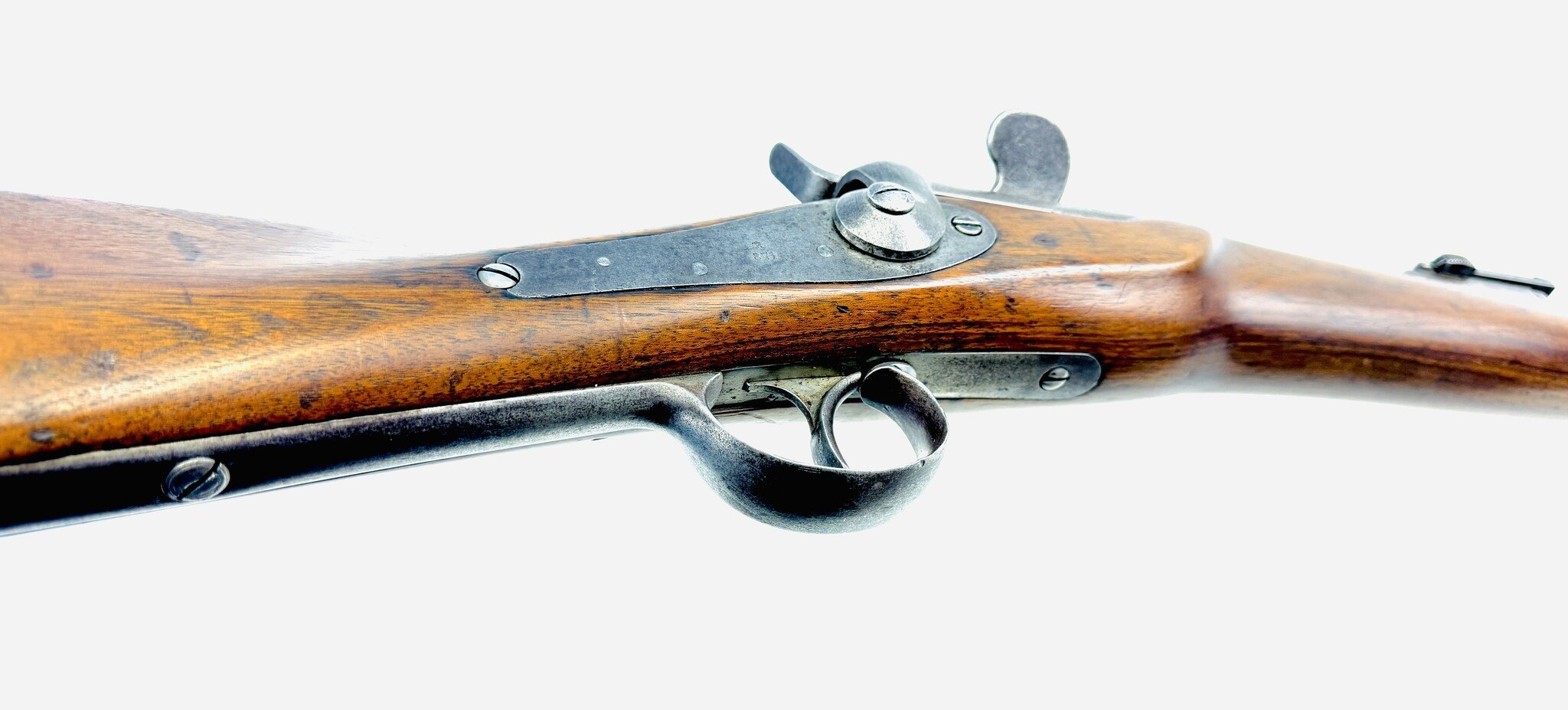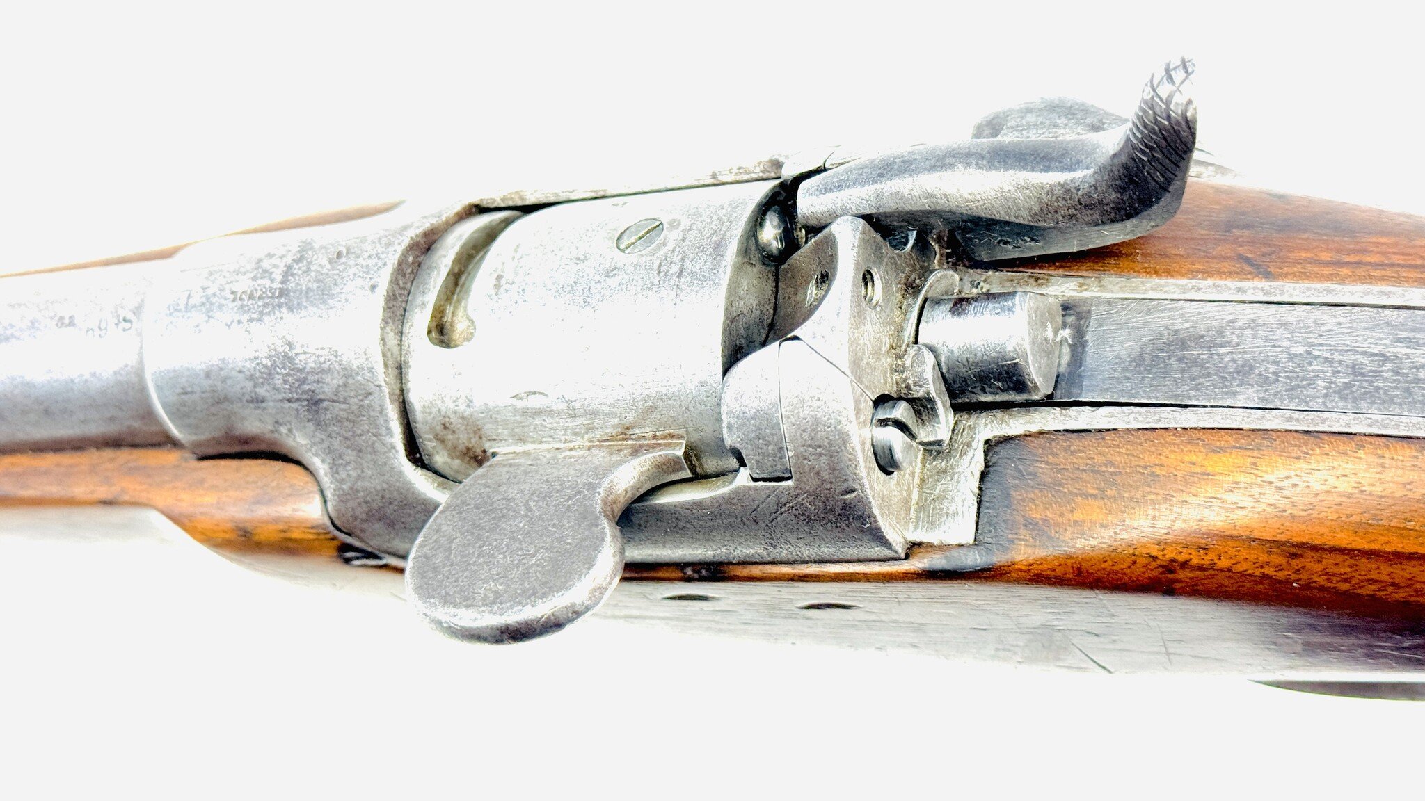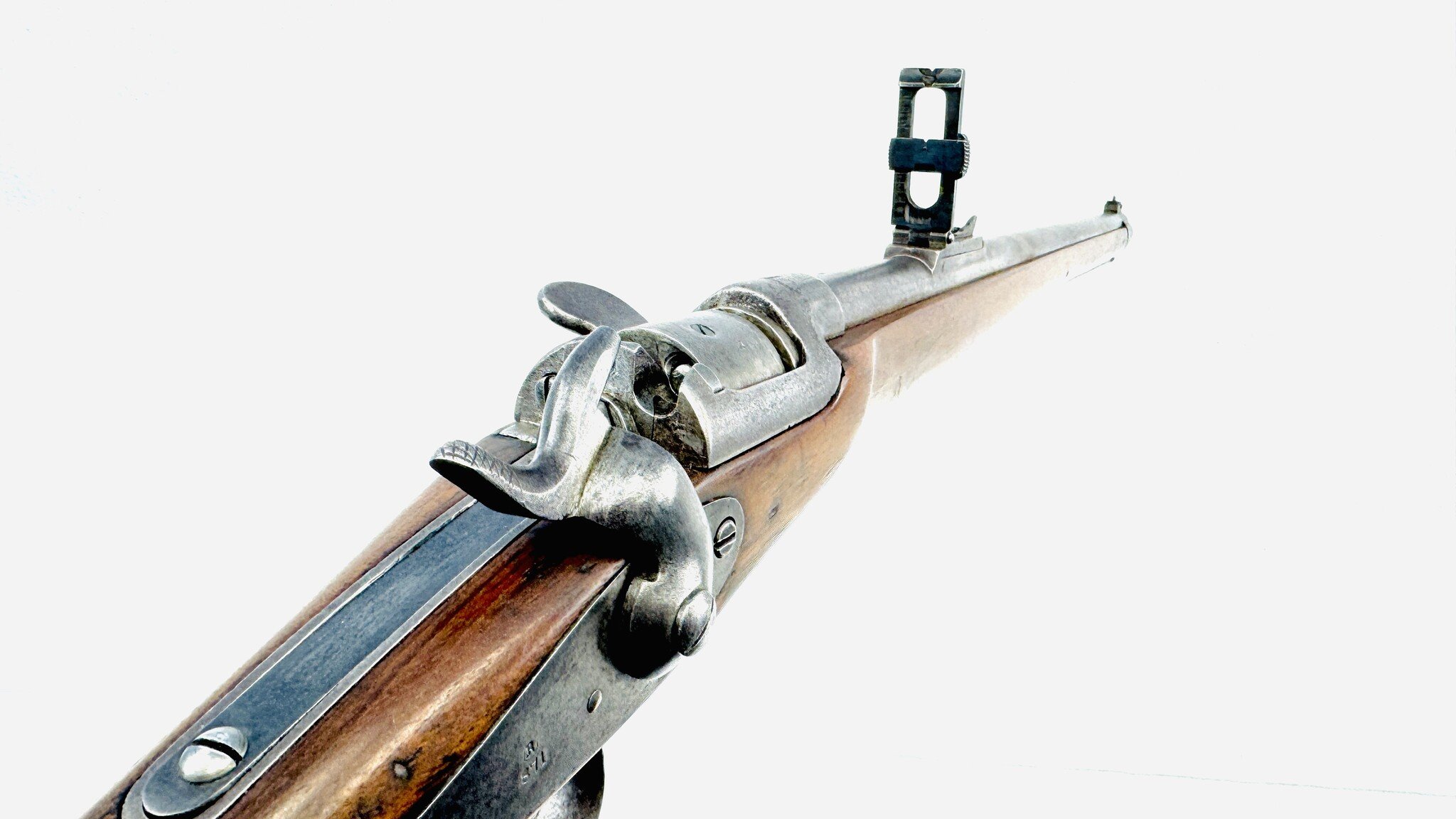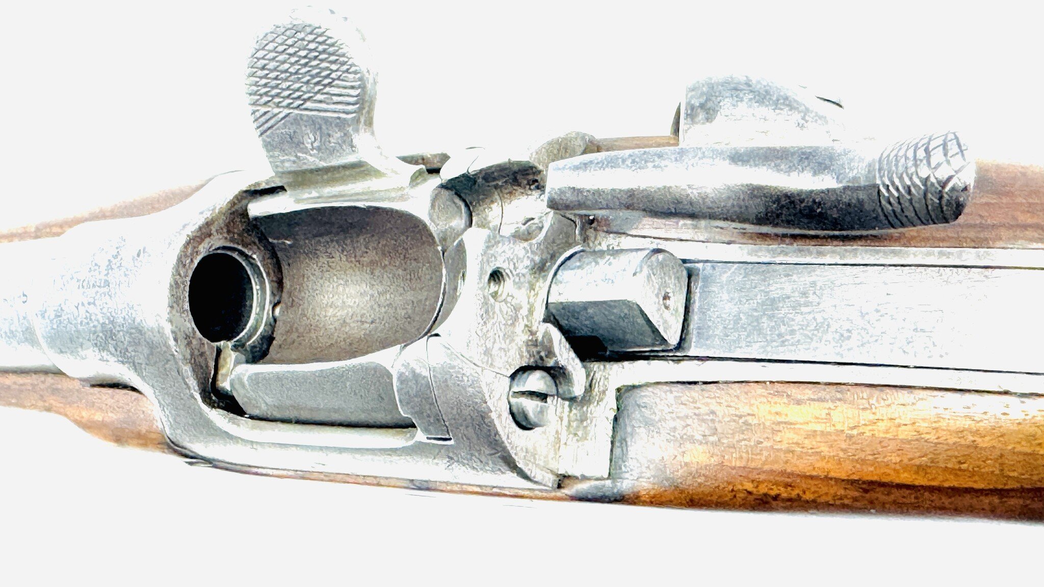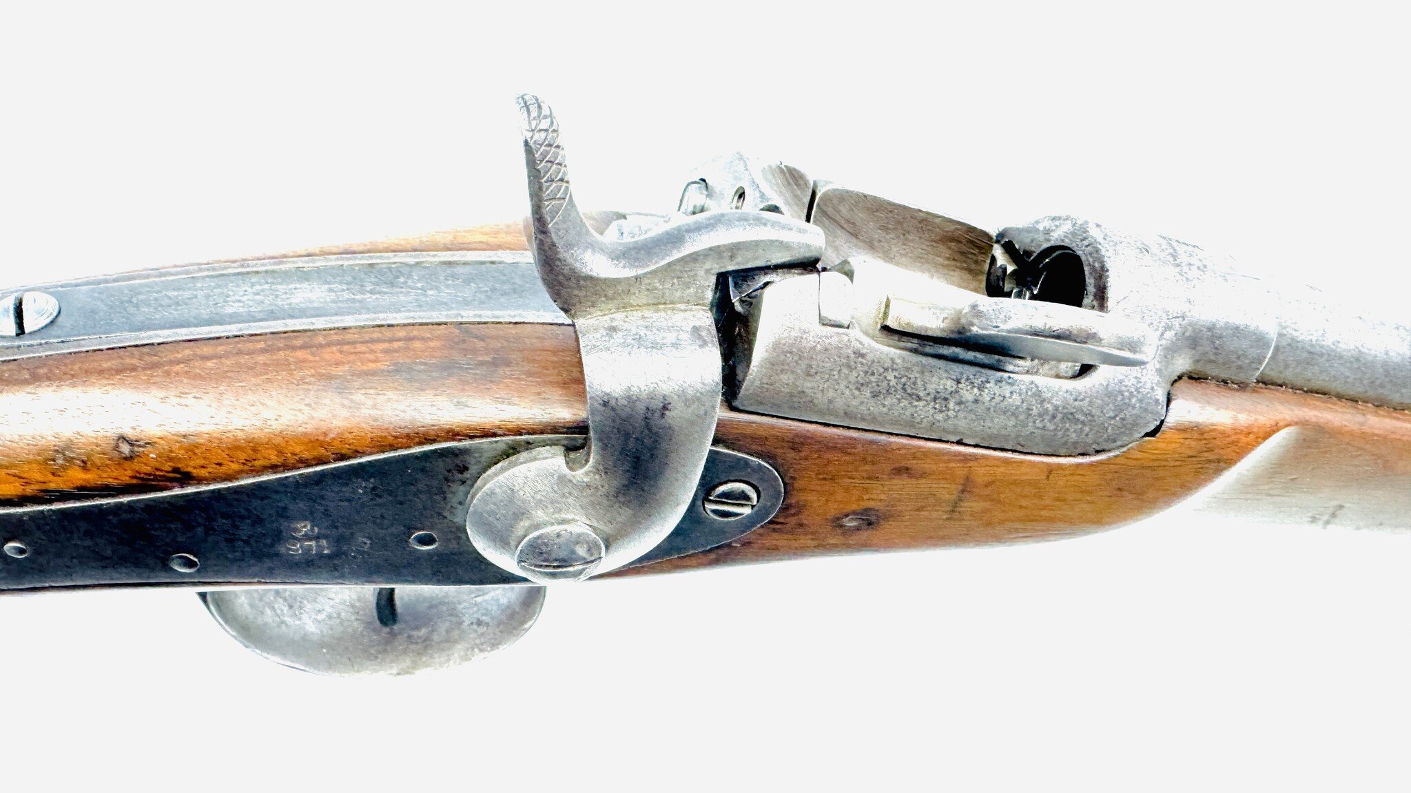 For the most part, the Werndl is a conventional military rifle of the day but with a uniquely creative metallic cartridge action. Its early version is fitted with a back-action lock powering a conventional hammer, but the receiver is a large, hollowed-out fist of steel, left unblued, enclosing a solid cylindrical drum rotating on a central axis pin, one side of which is scooped out to form a loading ramp and to expose access to the chamber.