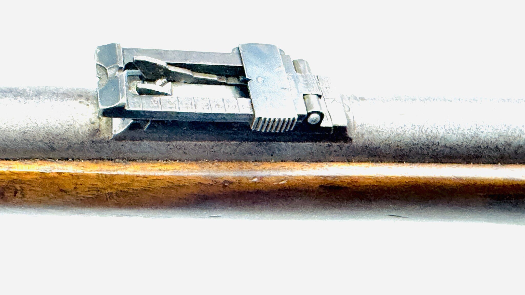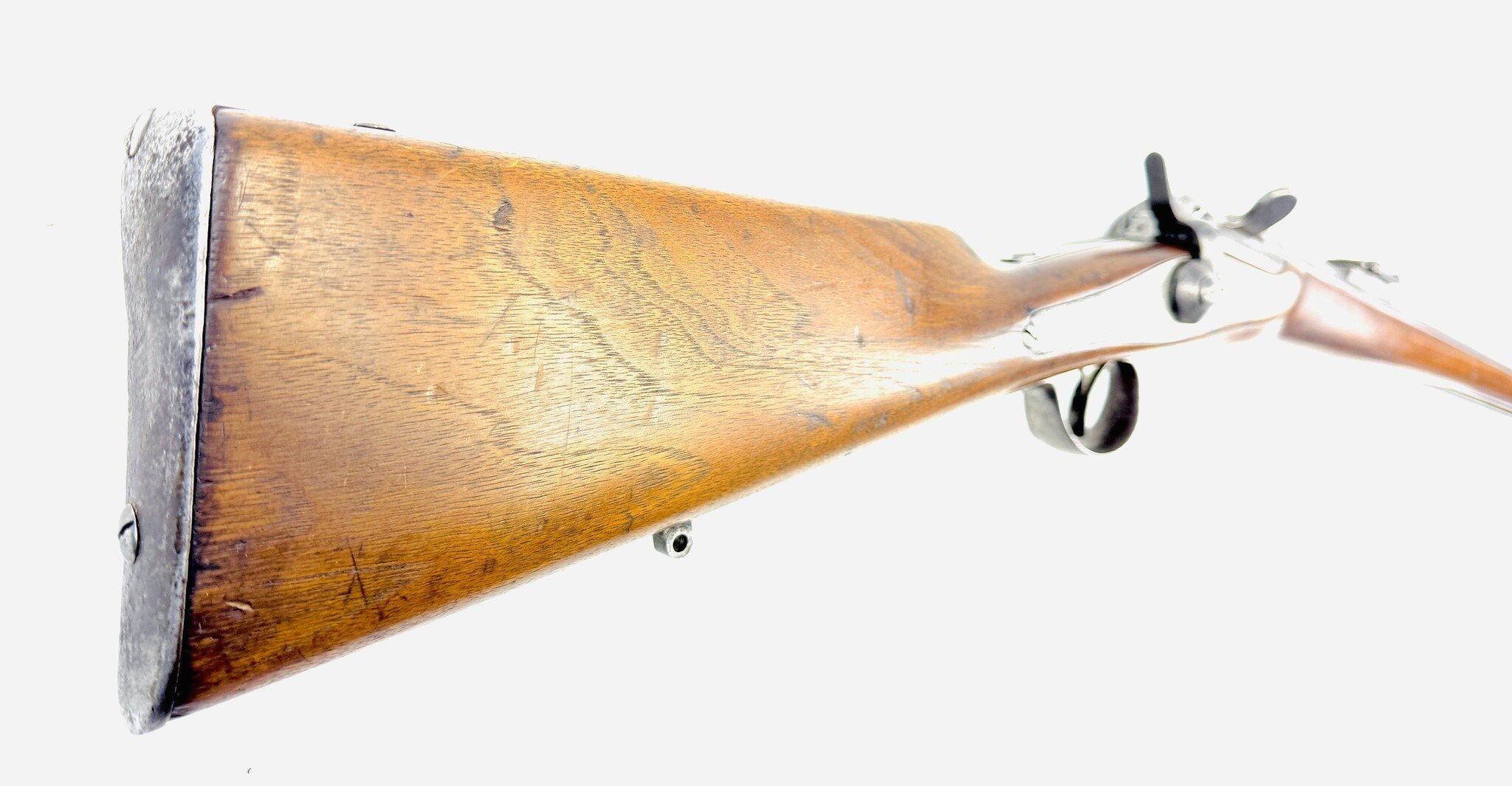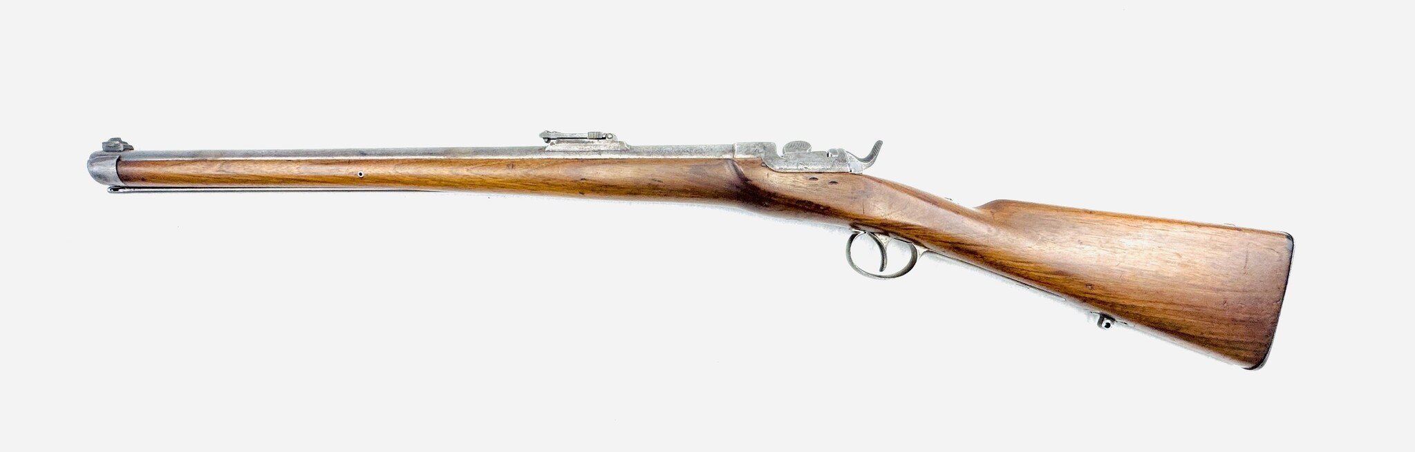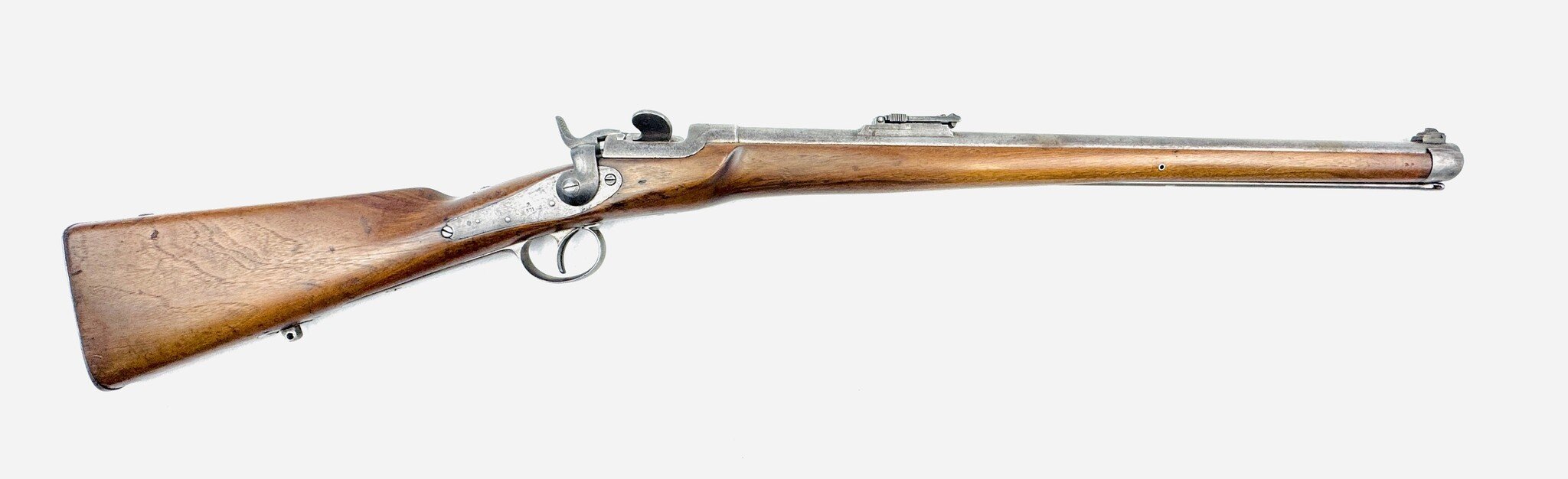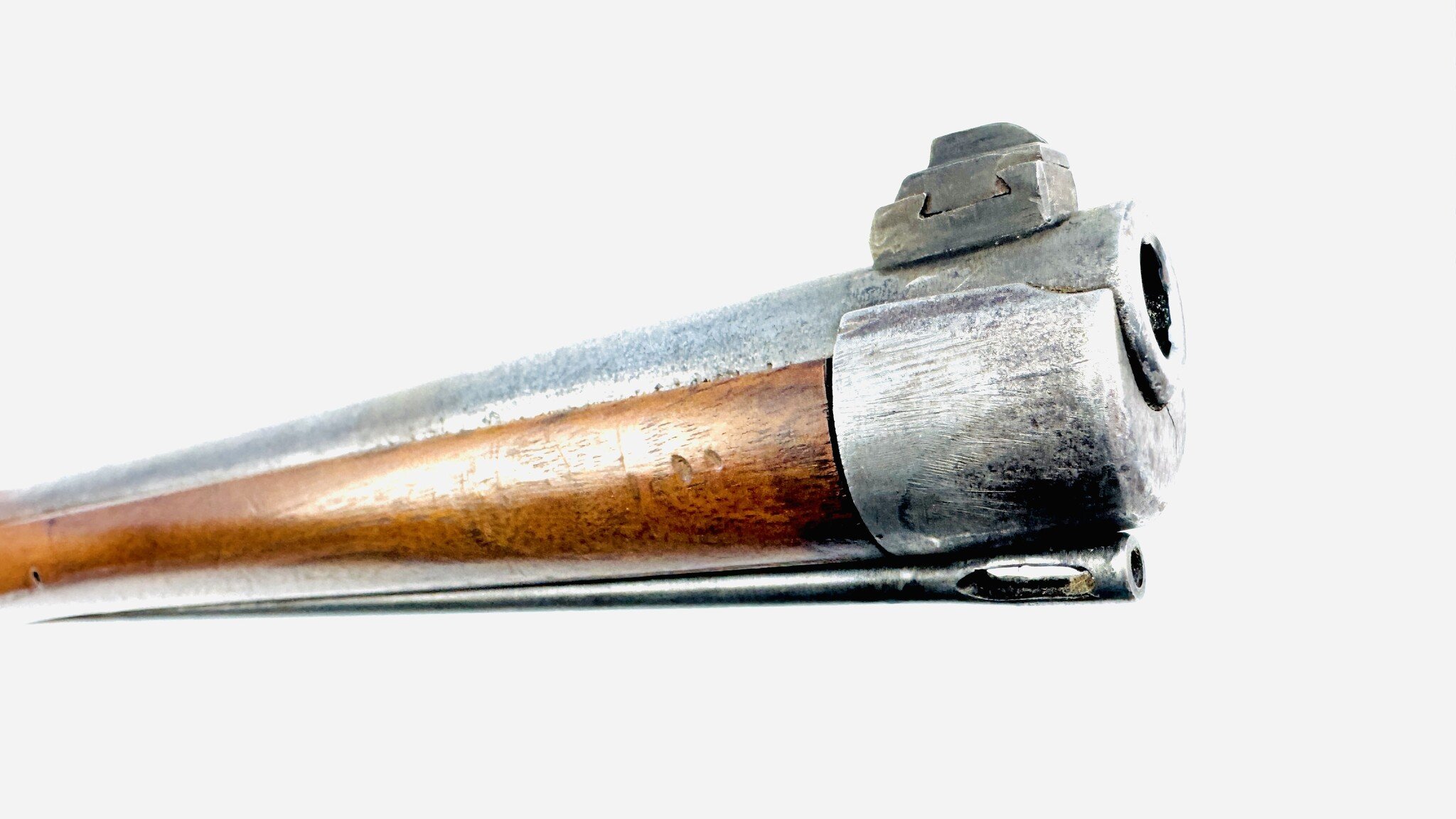 For the most part, the Werndl is a conventional military rifle of the day but with a uniquely creative metallic cartridge action. Its early version is fitted with a back-action lock powering a conventional hammer, but the receiver is a large, hollowed-out fist of steel, left unblued, enclosing a solid cylindrical drum rotating on a central axis pin, one side of which is scooped out to form a loading ramp and to expose access to the chamber.