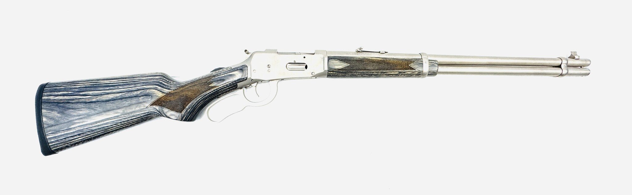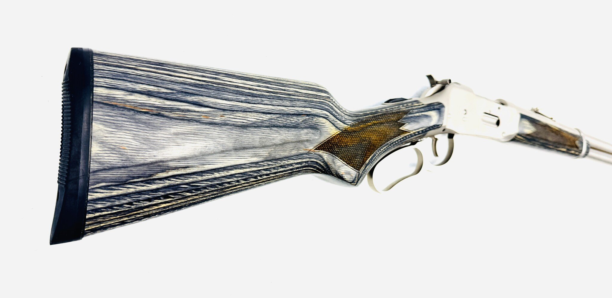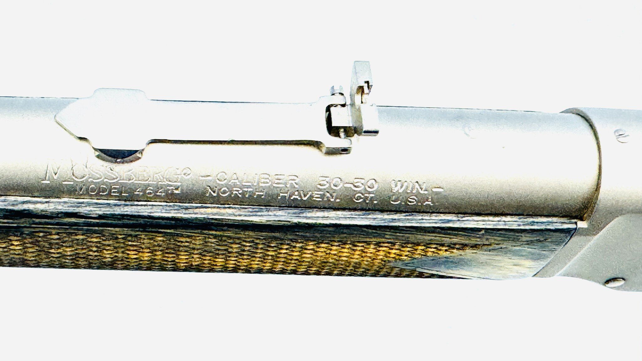 The Mossberg Model 464 Stainless (Marinecote) .30-30 with gray laminate stock is a durable, all-weather brush gun, often praised for its excellent, sharp checkering, comfortable grip, and reliable, fast-handling performance. Excellent Condition.