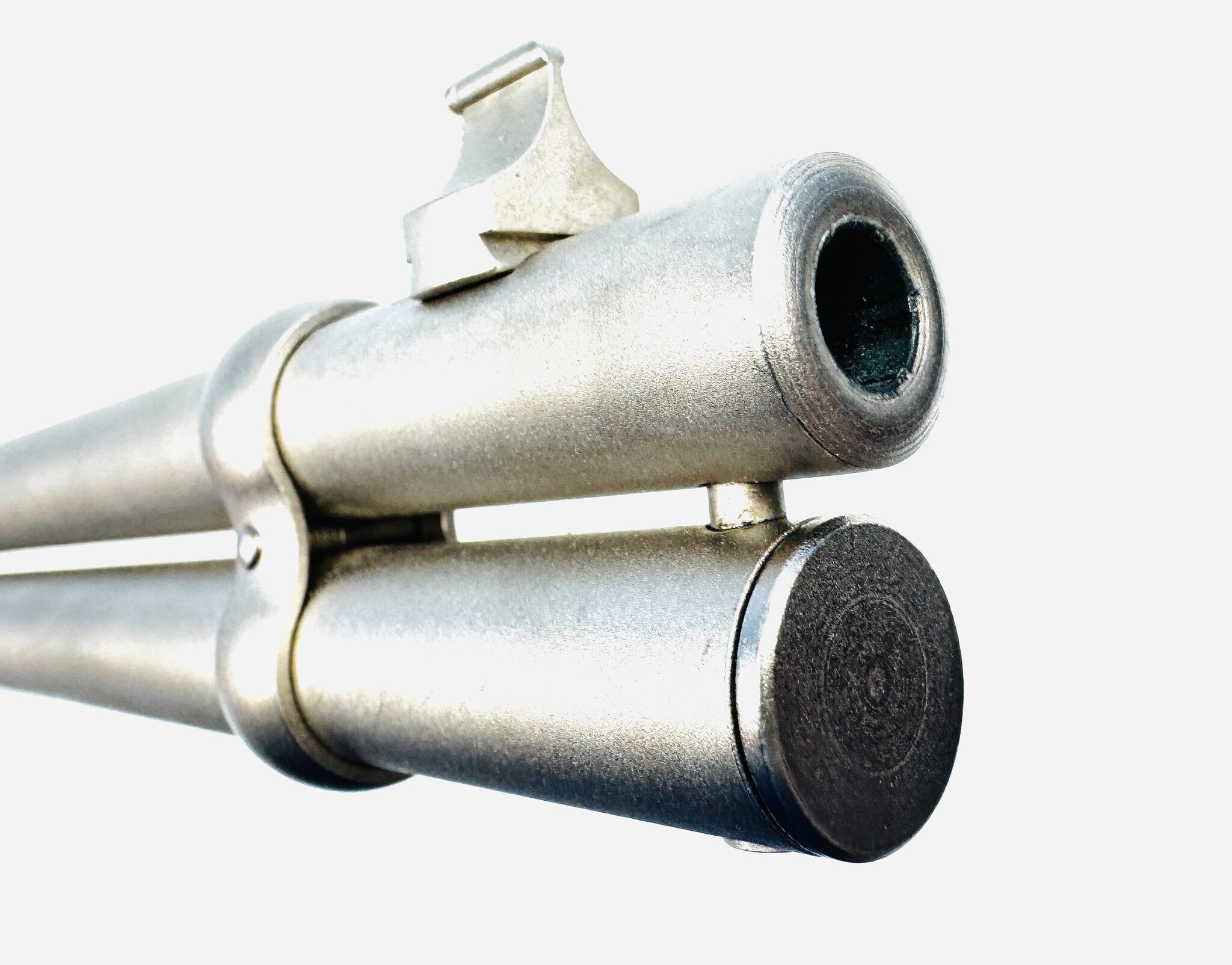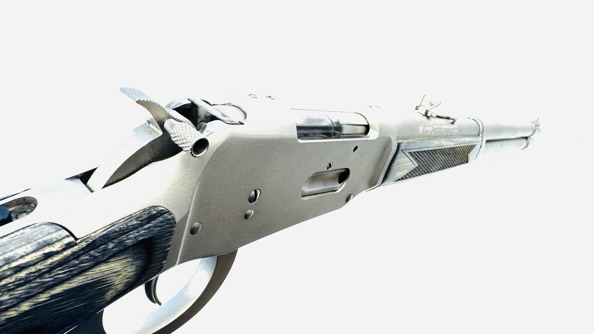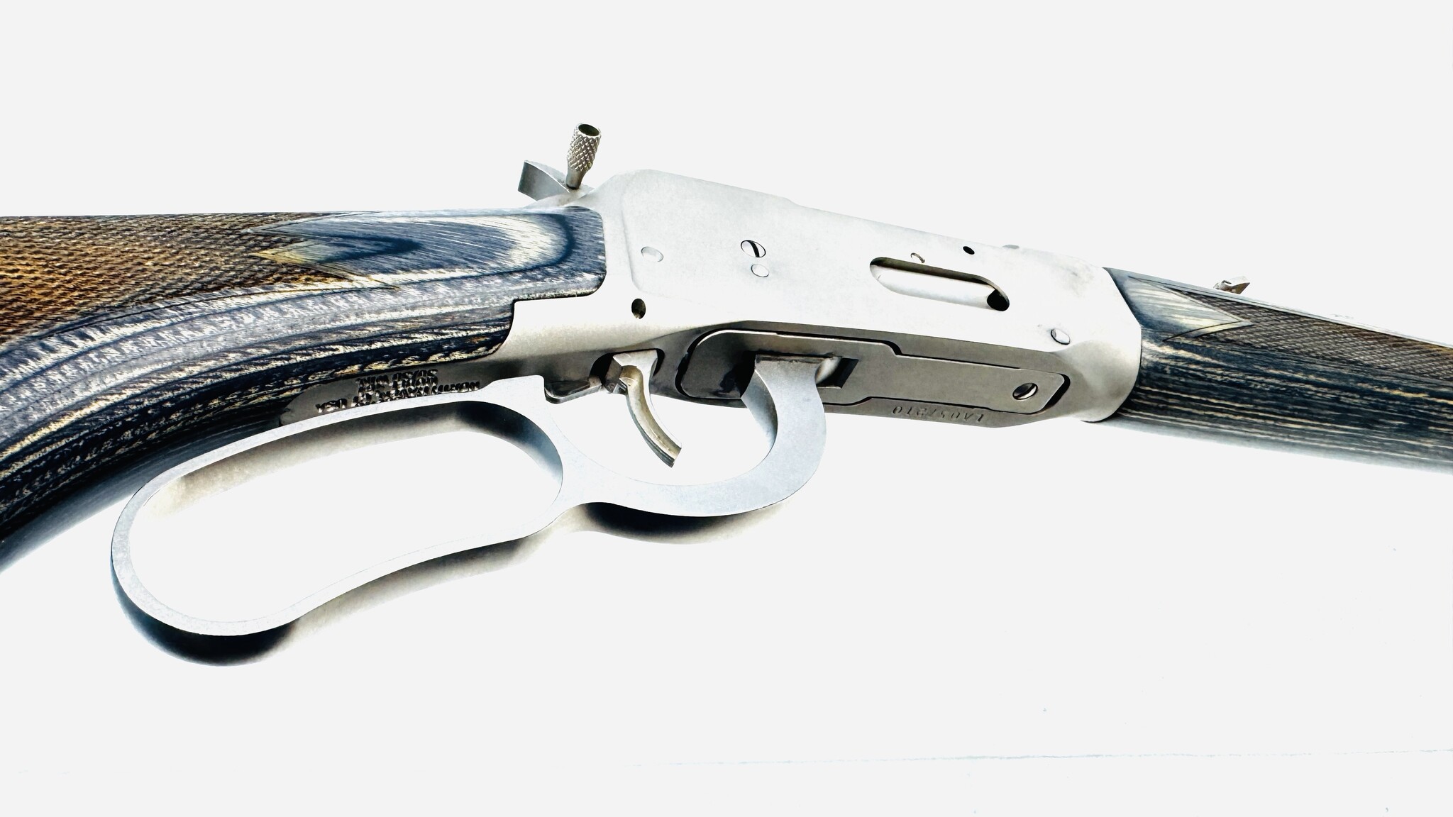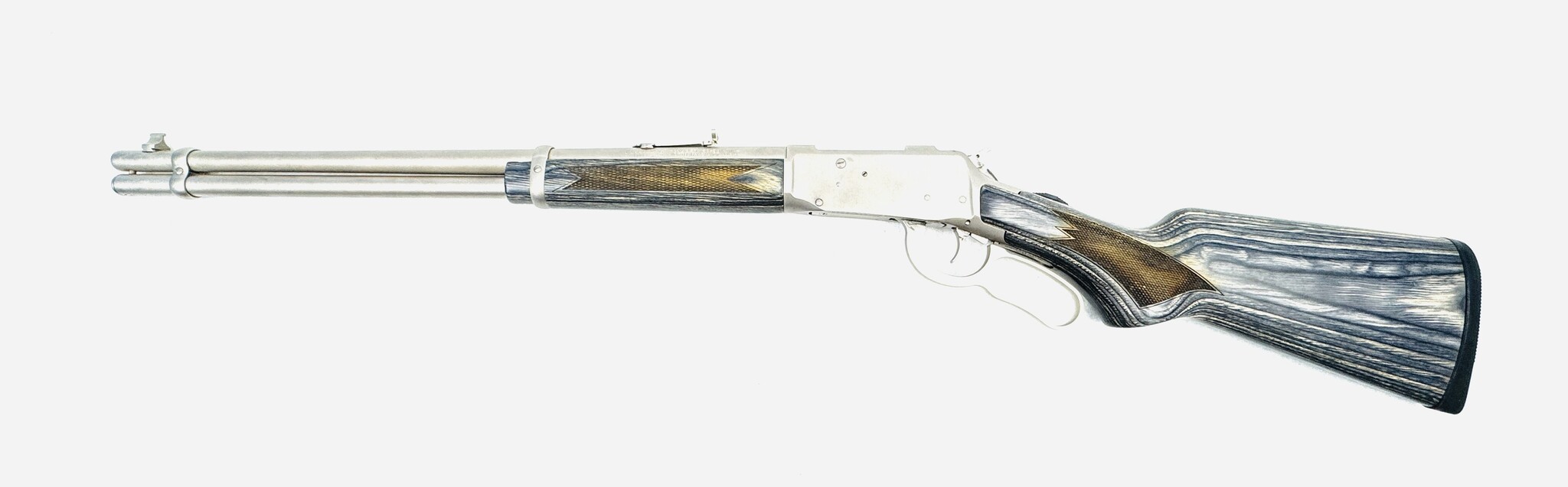 The Mossberg Model 464 Stainless (Marinecote) .30-30 with gray laminate stock is a durable, all-weather brush gun, often praised for its excellent, sharp checkering, comfortable grip, and reliable, fast-handling performance. Excellent Condition.