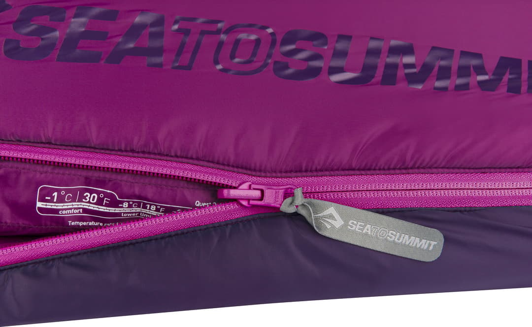 The Quest women's synthetic mummy sleeping bag is a great value option for weekend warriors and new campers.Entry-level doesn't mean we've cut corners on comfort and versatility. Like all Sea to Summit synthetic mummy sleeping bags, the Quest utilizes WaveLoft construction to allow the insulation to expand out into air-trapping curves for maximum warmth. As the temperature rises, the full-length zipper(which curves around through the foot box)allows you to sequentially increase ventilation to the point where the sleeping bag can be opened flat and used as a quilt. The broader mummy cut of the Quest gives women more room to move and allows a natural sleeping position.Features• WaveLoft construction for improved air-trapping for maximum warmth• Quality DWR-treated nylon shell material helps repel external moisture• Comfortable 20D nylon liner fabric• Includes stuff sack• Full-length Ykk® #5 main side zip extends through the foot box zip for increased ventilation and allows the bag to be used as a comforterMaterials• Shell Fabric: 30D nylon treated with DWR• Insulation: Polyester(using WaveLoft™ construction)Specifications• Best Use: Backpacking• Shape: Relaxed Mummy• Zip Options: Full length left side zipper with two sliders. Unzip fully to use as a quilt or comforter• Bag Series: Regular/Long: Quest 2• Bag Weight: Regular: 2lbs 15.3oz, 1340g/Long: 3lbs 4.6oz, 1490g• Compressed Vol(ASTM Standard): Regular: 9.8L/Long: 11.2L• Compression Sack: Regular: L-20L to 6.5L/Long: XL-30L to 10L• Fits Up To Height: Regular: 5ft 7in, 170cm/Long: 5ft 10in, 179cm• Season Rating: Regular/Long: 2.5 Season• Stuff Sack Size: Regular: L-15L/Long: XL-20LTemperature• Women's Temp Rating(EN Comfort): Regular/Long: 30°F/-1°C