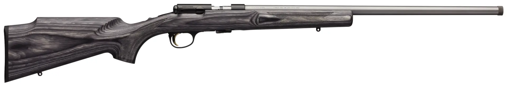 Browning T-Bolt 17 HMR Varmint Gray Laminate 22" Stainless Steel SR Threaded (1/2"-28) for a suppressor, heavy matte stainless steel barrel, blued action, gray laminate stock with Monte Carlo cheekpiece.