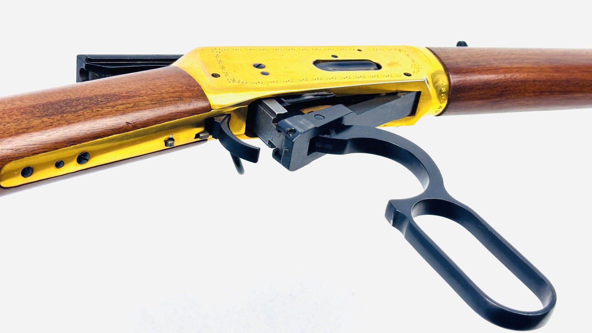This unfired 1973 Winchester Model 94 RCMP Centennial is a 30-30 "musket" configuration with a 22" barrel and full-length forend. Featuring a gold-washed receiver with engravings, stock medallion, and walnut furniture, it was produced to honour the RCMP.